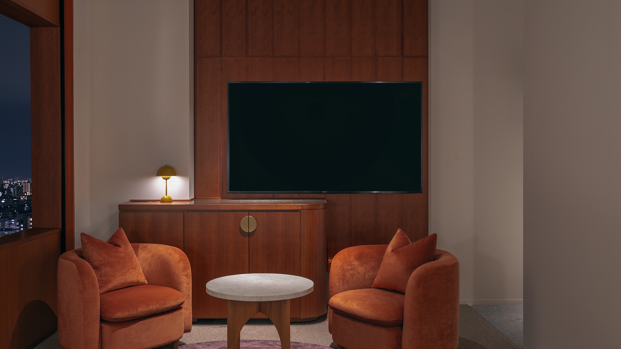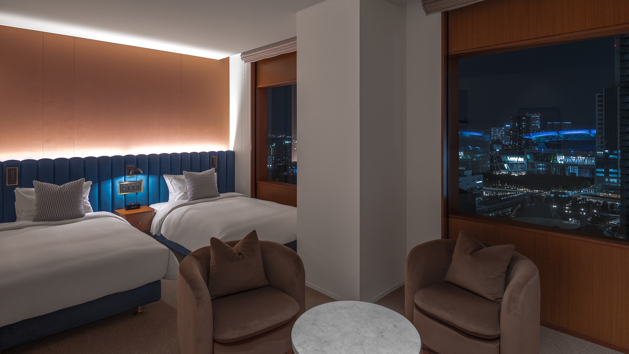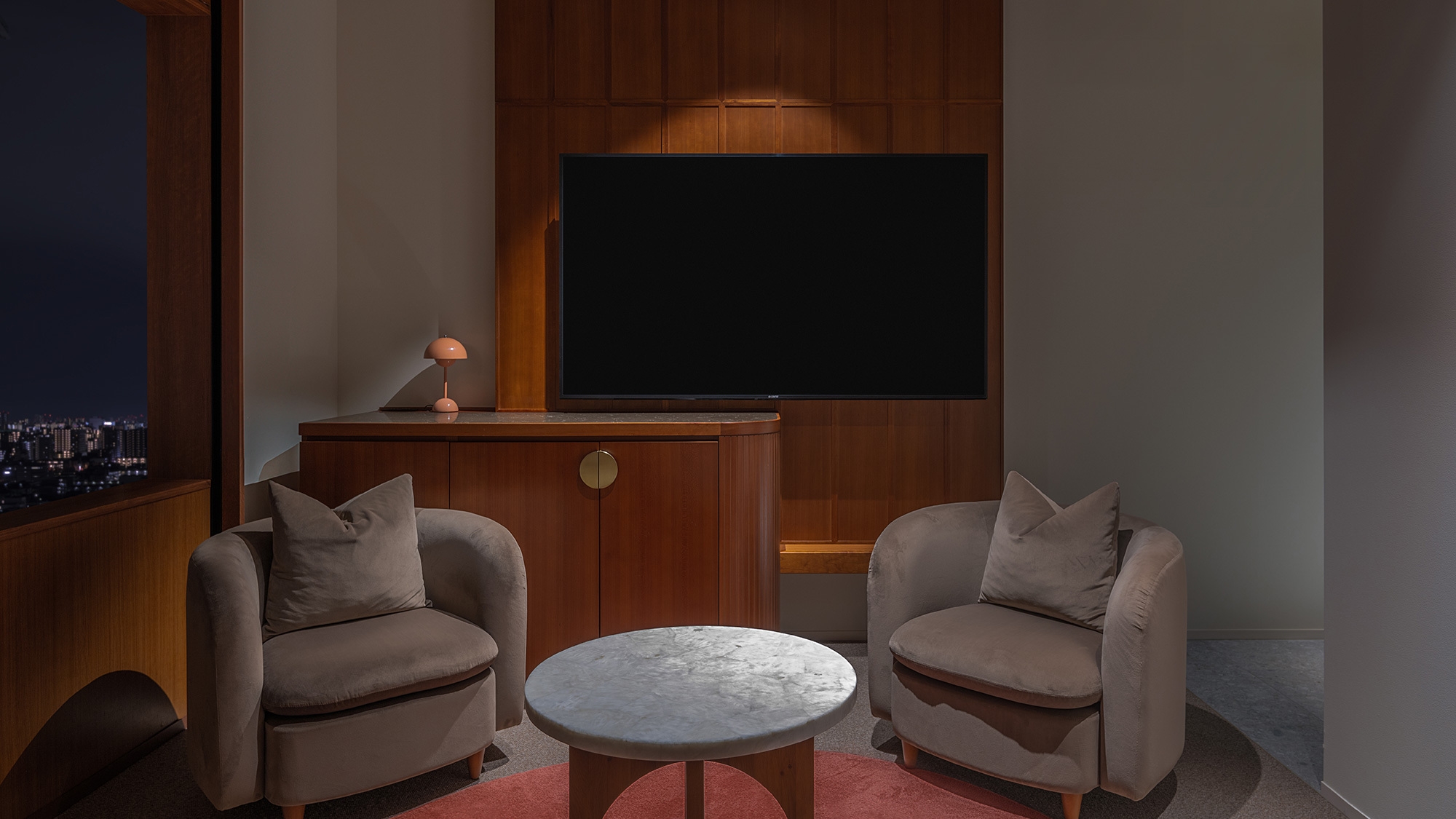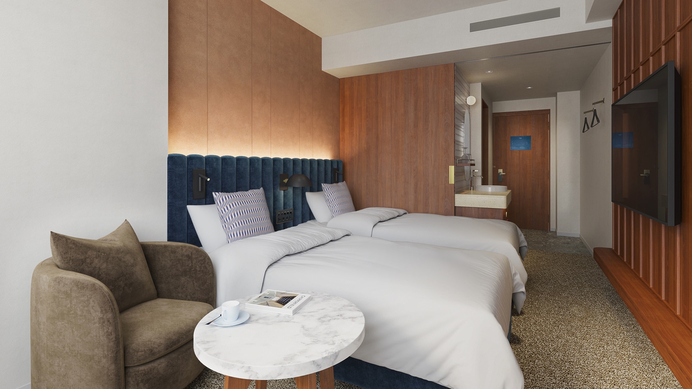 【洗練された大人のための空間】寛ぎの空間を優先し、デスクを排除したツインルームです/19平米/ベッド幅97cm(ハリウッドツイン可)/55インチスマートTV