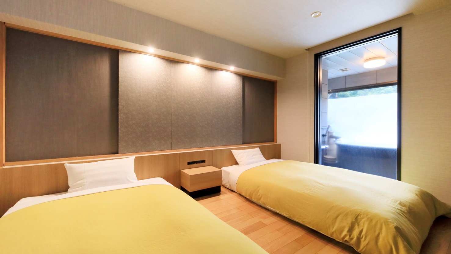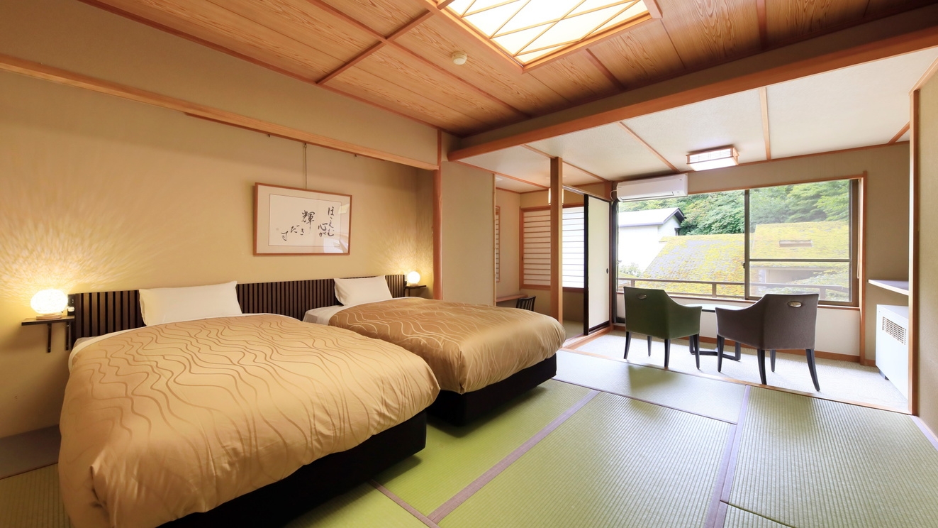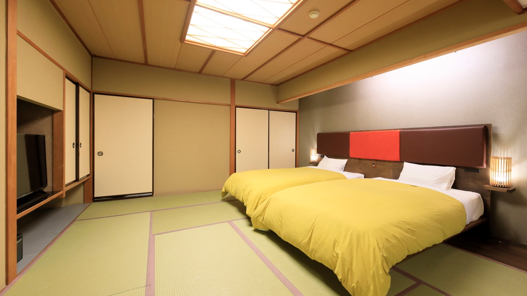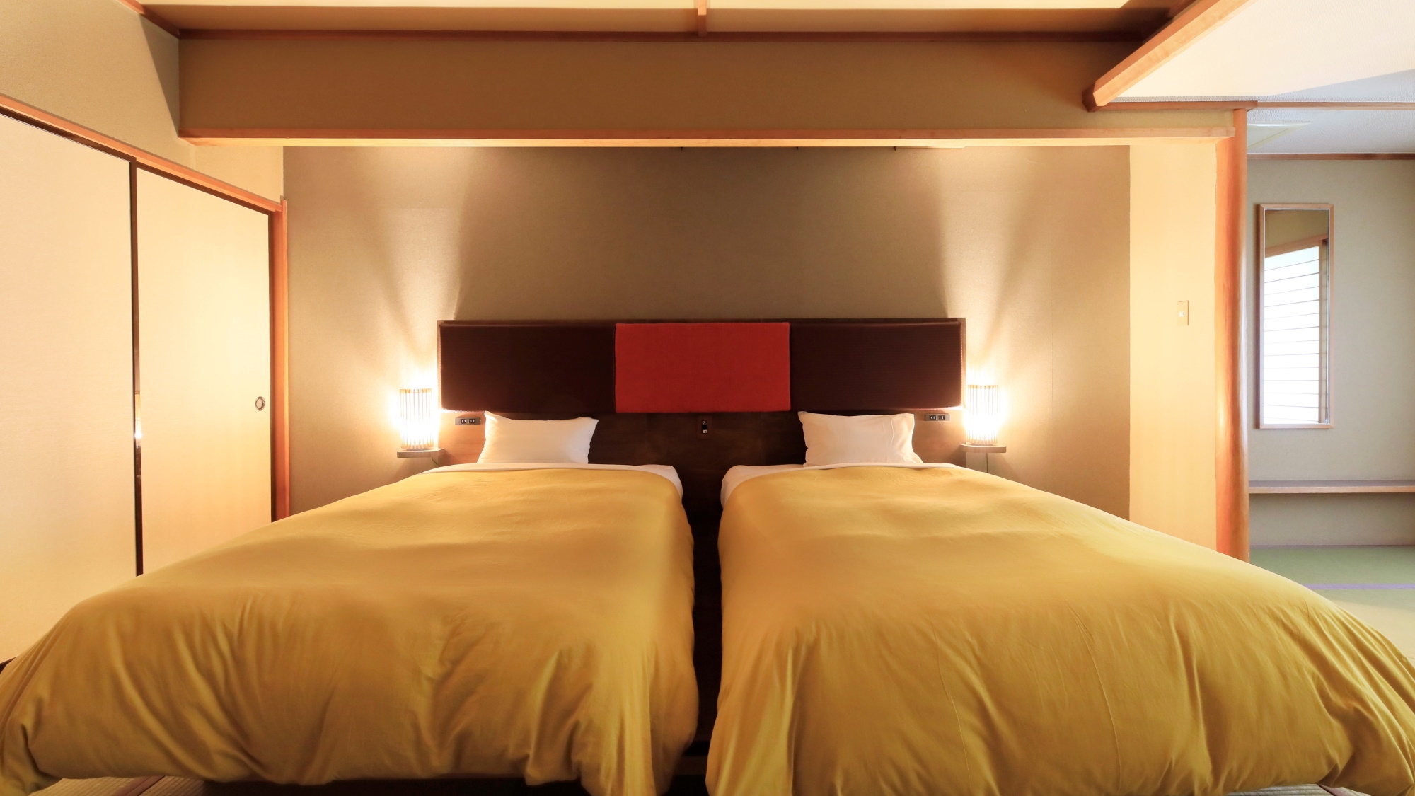 和室にツインベッドを配したお部屋。カップルやおひとり様、ご高齢の方にも安心してお使いいただけます。3名以上はお布団1組をご用意します。(テレビ:BS視聴不可)