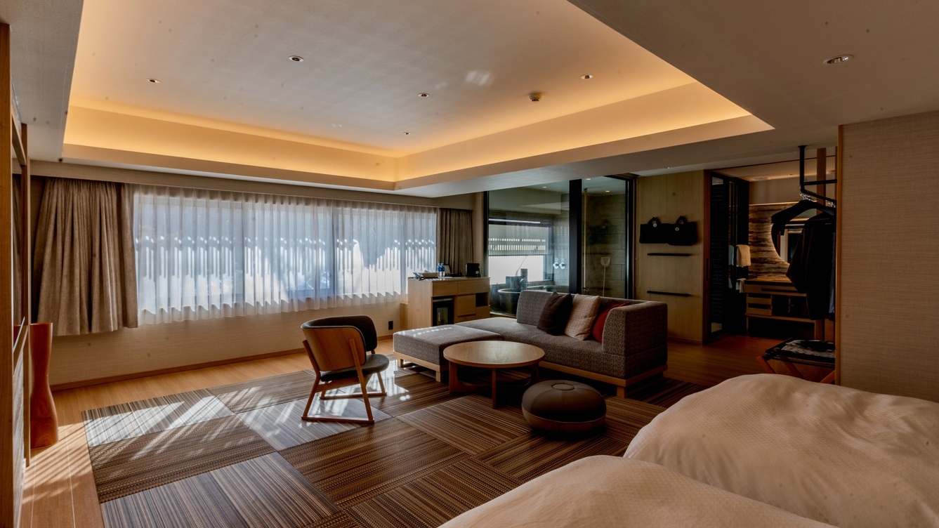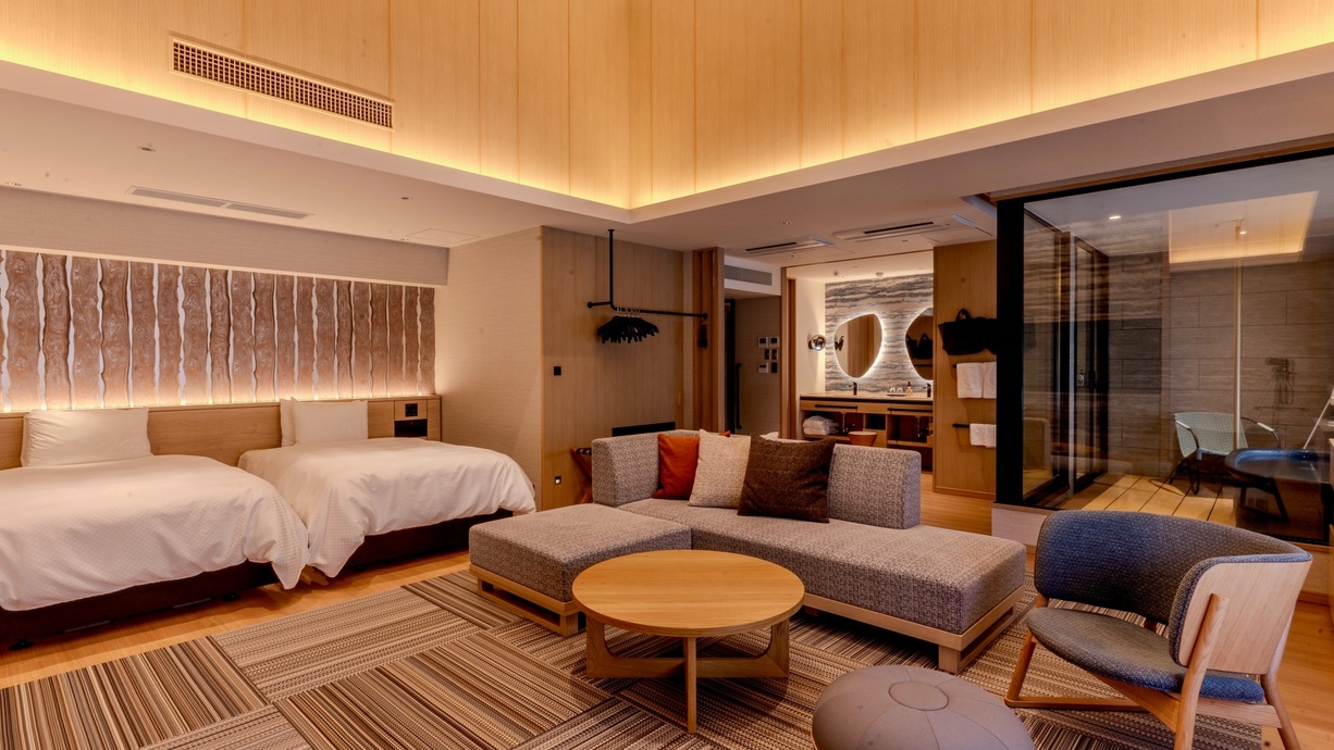 サウナ&露天風呂付客室でツインルームとトリプルルームの2部屋続きの特別室です。