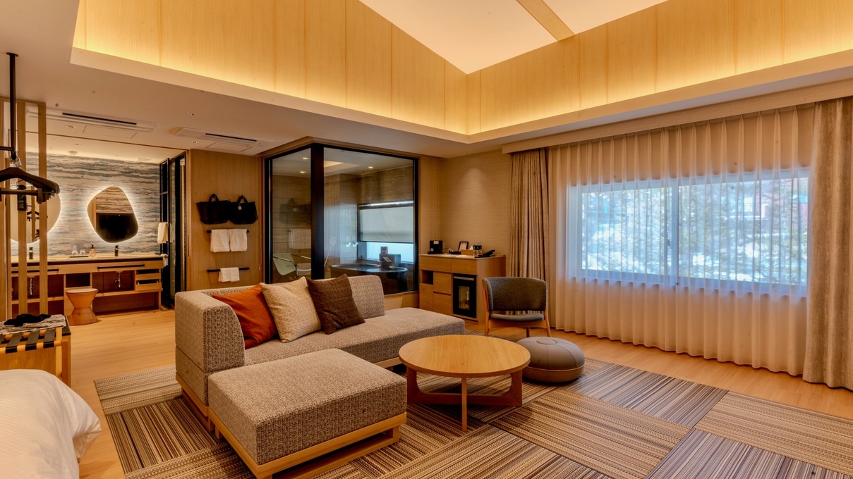 客室57平米/定員2名/雪のない春から秋の季節は(GW〜11月)は目の前に広がる専用テラスの利用が可能。