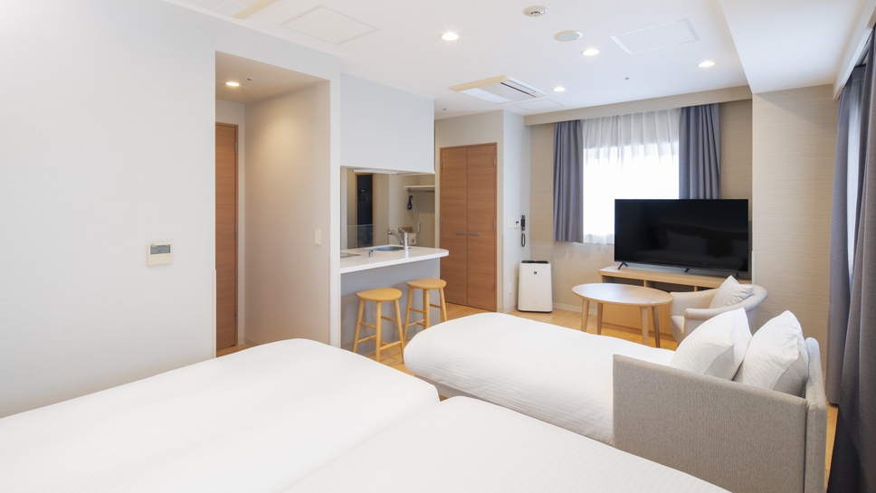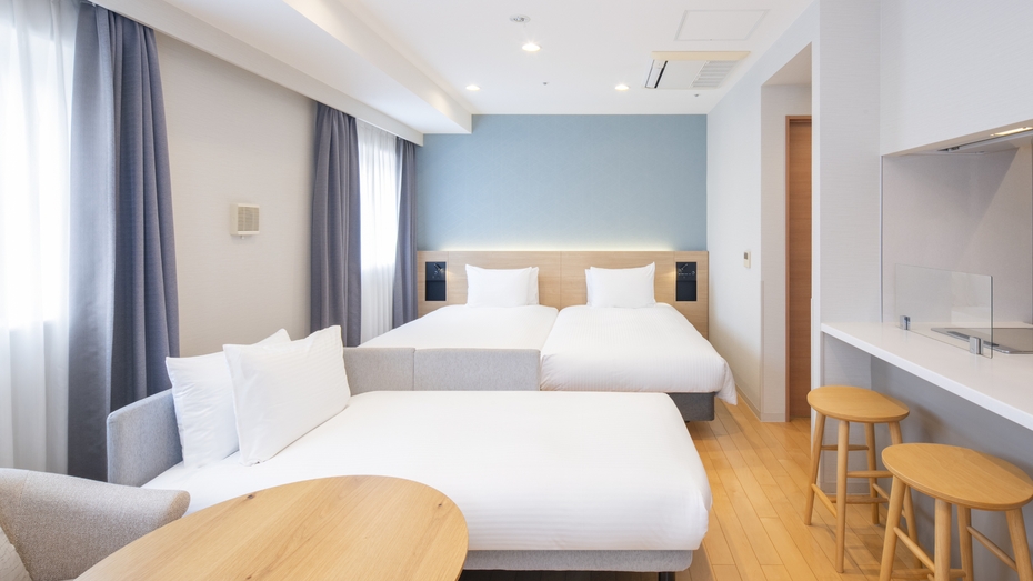 【2025年5月改装】★禁煙★ベッドタイプ 正ベッド(110cm × 206cm) 2台 + ソファベッド ※バスルーム:ユニットバス
